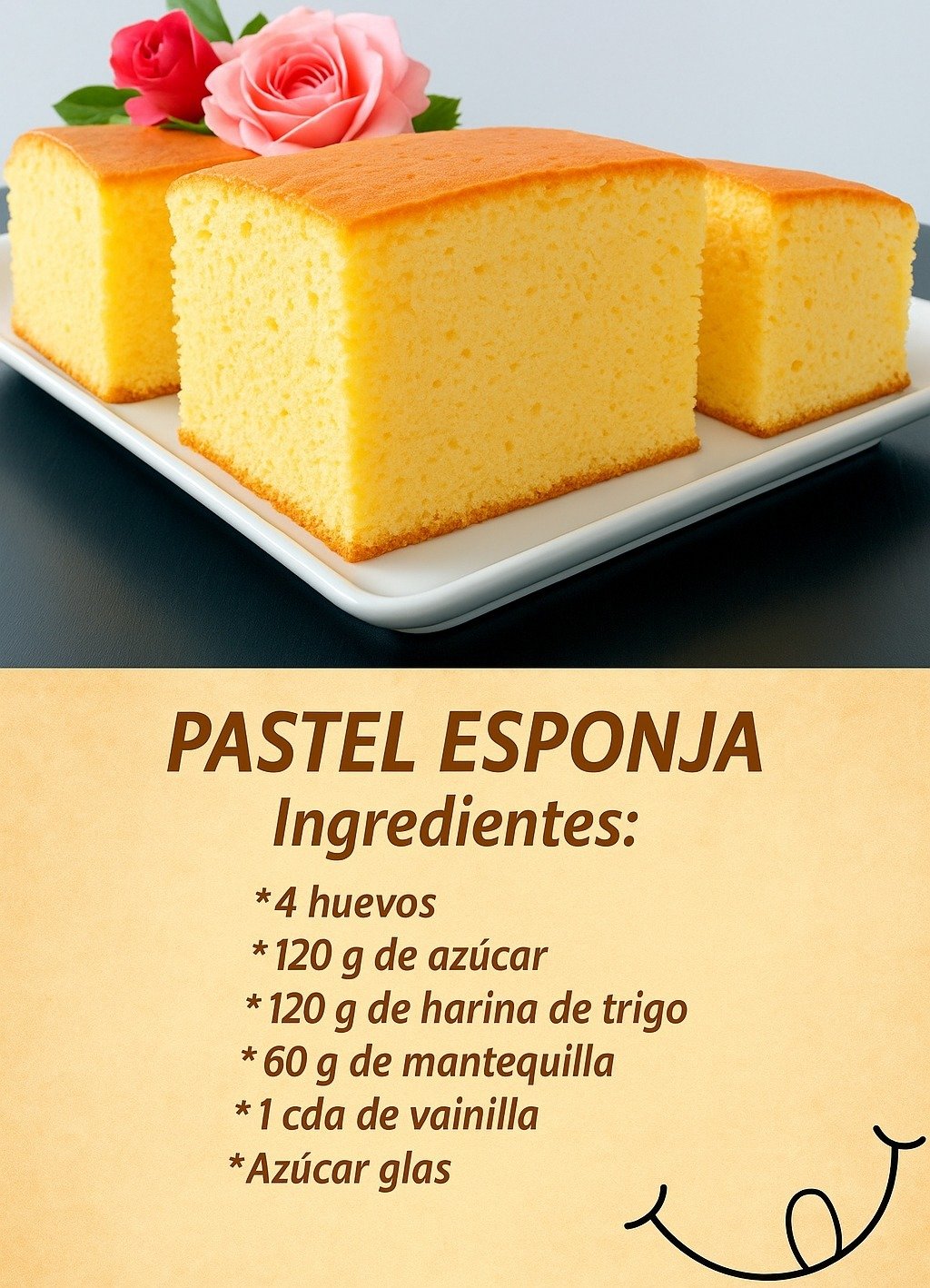 Ingredientes:4 huevos120 g de azúcar120 g de harina de trigo1 cucharadita de polvo de hornear60…